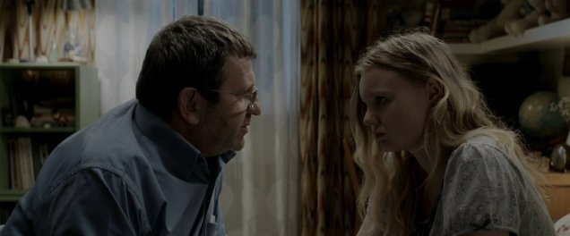 Bacalaureat is surprisingly kind and without any bloodshed or physical violence, but I had to think of Michael Haneke’s movies for two reasons. There is a rock smashing through the Aldeas’ living-room window, and later through the windshield of Dr. Aldea’s car. These two scenes remain unexplained, but it’s impossible not to think of Haneke’s Caché (2005) with those grainy videotapes. And Eliza is played by Maria Dragus, whose distinctive features you might remember from Haneke’s The White Ribbon (2009).