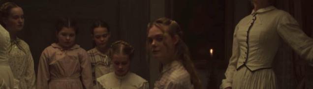 That man, Corporal John McBurney, is the first human being allowed to stay with them, and so becomes a screen for their projections. Amy, for instance, the girl who finds him, is happy to befriend him because he is interested in animals and birdsong, just like her. For Alicia, he is her romantic hero, and she kisses him while he is unconscious, or pretends to be. For Jane, he is one of those feared abusers of women; the army is full of those, she is convinced. Strangely, McBurney knows exactly what to say depending on which female enters the music room. That’s only strange until you realise that the movie subtly employs the female gaze instead of observing the situation from a neutral point of view. Sofia Coppola took the 1966 novel by Thomas Cullinan as the starting point, threw out the side stories about incest and slavery that also feature in the 1971 Don Siegel/Clint Eastwood version, wrote a new screenplay, and made it into a movie about female desires.