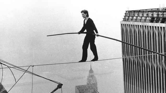 He is up there in the air, 417 meters above ground, a mere speck to his random audience, so you could easily mistake him for a plane or a bird. He might appear semi-abstract to you. Legend has it that, as a Parisian teenager, he had to go his dentist, but found a picture of the not-yet-built World Trade Center in New York in a magazine and drew a line between the two roofs. He left, his toothache all but forgotten, and he perfected his considerable talent as a tightrope walker and waited for the towers to be built. Until then, Philippe Petit worked his way up, from juggling and unicycling in Parisian streets to walking the tightrope between the two towers of Notre Dame, to doing the same thing between two towers of the Sydney Harbour Bridge. And then the Twin Towers got built, and in 1974, Petit was ready for them. Or they were ready for him.