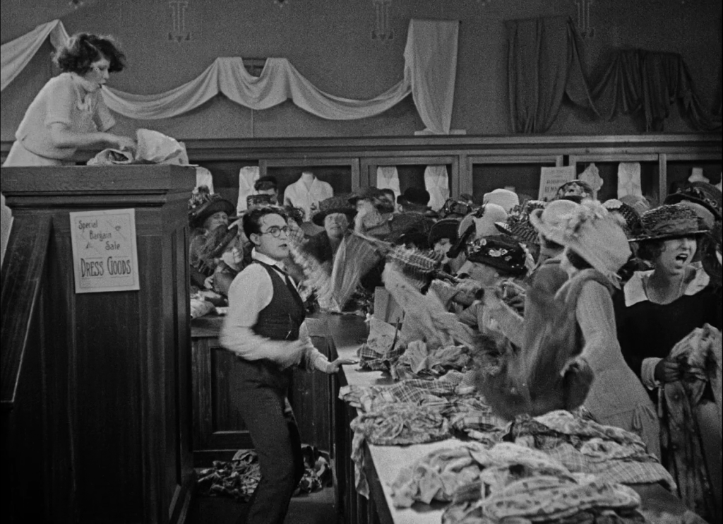 The idea that there is no poetry to Lloyd’s comedy is belied by the very first scene in Safety Last! The protagonist, “The Boy”, even called “Harold Lloyd” later in the film, is shown behind bars, with what looks like a gallows in the background. A visiting priest shakes the hand of the downcast Lloyd, his fiancee and his mother join him, visibly upset. They walk away, their backs to us, only to re-enter… a train station. The bars are simply the entrance to the platform, the noose just a trackside pickup hoop. This is where the young man leaves all he has ever known, to go out into the world and seek his fortune. And it is likened, not to a grand adventure, but to a death sentence. Take that, snooterati. Of course, the big city doesn’t bring the fortunes the young man is hoping for. As a beleaguered sales-clerk he suffers indignity after indignity, with very little to show for it. His best friend and roommate, an inveterate building-climber, has a low-wage gig as a builder. Together they can’t even make rent. However, as the movie-convention dictates, he pretends to be a huge success to the homefront. (Learn to manage expectations Harold!) Though it does lag in the middle, the first part features iconic imagery we can all relate to as a modern audience. The chaos of a daily commute in public transport: