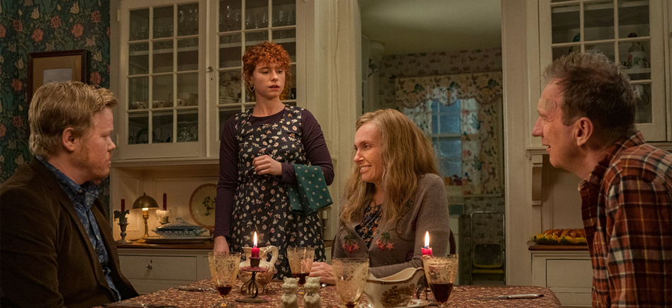 At the latest when they arrive at the farm belonging to Jake’s parents, we tend to agree with her when, again and again, she thinks of ending things – even if we’re not entirely clear on what she means by this. We want her to leave Jake and escape back to the city and to normalcy – anything to get away from this house and those people, the stories of maggot-infested pigs and the childhood bedroom straight out of Psycho. Jake’s mother (Toni Collette) and father (David Thewlis) are creepy to begin with, and certainly no more reassuring when they begin to age or grow younger by decades within the time it takes the protagonist to leave the room and return again. And that’s not even mentioning Jimmy the border collie, who seems to blink in and out of existence when he isn’t shaking ceaselessly, as if old age and the sheer ominousness of his surroundings have put him in a permanent state of existentialist seizure.