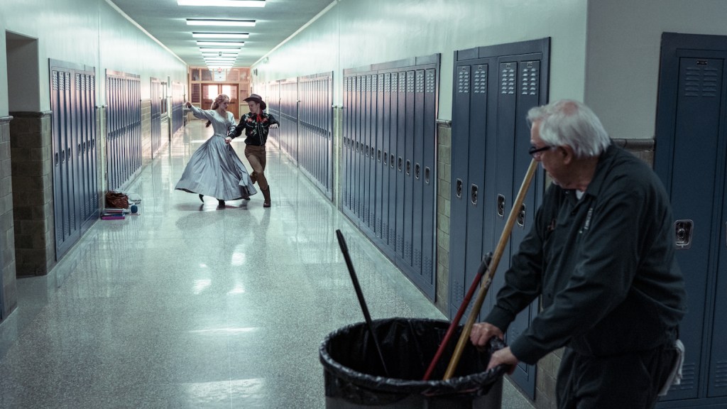 It is difficult to discuss the film without spoiling some of its key mysteries, so this may be where readers who haven’t yet seen I’m Thinking of Ending Things may want to check out until they have. Gone? Okay, here goes: Kaufman likes characters uncertain of the reality they inhabit like an ill-fitting coat. The young woman finds the world around her to be shifting and unstable, yet for her own unstable self, she still feels like the most real thing in the film, thanks in no small part to Buckley’s immensely engaging, human performance. Well, surprise, suckers: there is no young woman. She’s made up, even more so than your regular movie character. Throughout the film, we see glimpses of a sad, ageing janitor at a highschool, going through his daily tasks with an air of quiet desperation. This janitor is Jake – but in his mind, he rewrites himself and his life, trying to make them better than they are. Most importantly, he gives his young self a girlfriend modeled on a woman he was dismissed by (cruelly, in his mind). Yet, for most of the film, we see Jake’s fantasy under assault by reality seeping in – a reality where he is old, alone and seen by the young highschoolers as the creepy old dude sweeping the corridors.
