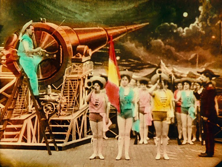 The finished product is now in the public domain – in both original and hand-painted colourised versions – so its easily enjoyed today. And as you watch it, its fun to notice how every scene is designed to cater to that early audience wanting to be thrilled. The audience goes from what would have been an impressively vast set, with fancy costumes, to the sight of genuinely imagined technology seemingly made real (a kilometre-long cannon required to shoot the scientist’s rocket into space). But while audiences might have been awed by the special effects that made the Moon Men seemingly explode when attacked, they also would have been charmed by the use of special effects to create moments of pure whimsy. There’s a peculiar scene where the scientists dream of star signs coming to live and – more effectively – the Moon itself, with a human face, Watching as the rocket gets ever closer before crashing to create the iconic image that has been used to market the film since the year it was made.