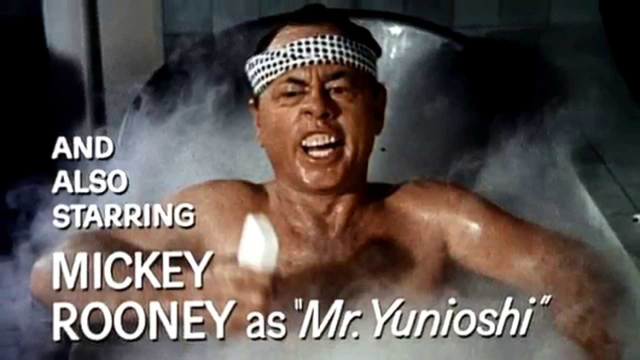 Then three minutes in – it happened. A good chunk of the cinema audience, myself included, gasped. This was not what we were expecting. Suddenly you could sense people getting very uncomfortable. Because three minutes in, Mickey Rooney appears on screen. In yellow make-up, false teeth and face prosthetics. As the comedy neighbour “Mr. Yunioshi”.
