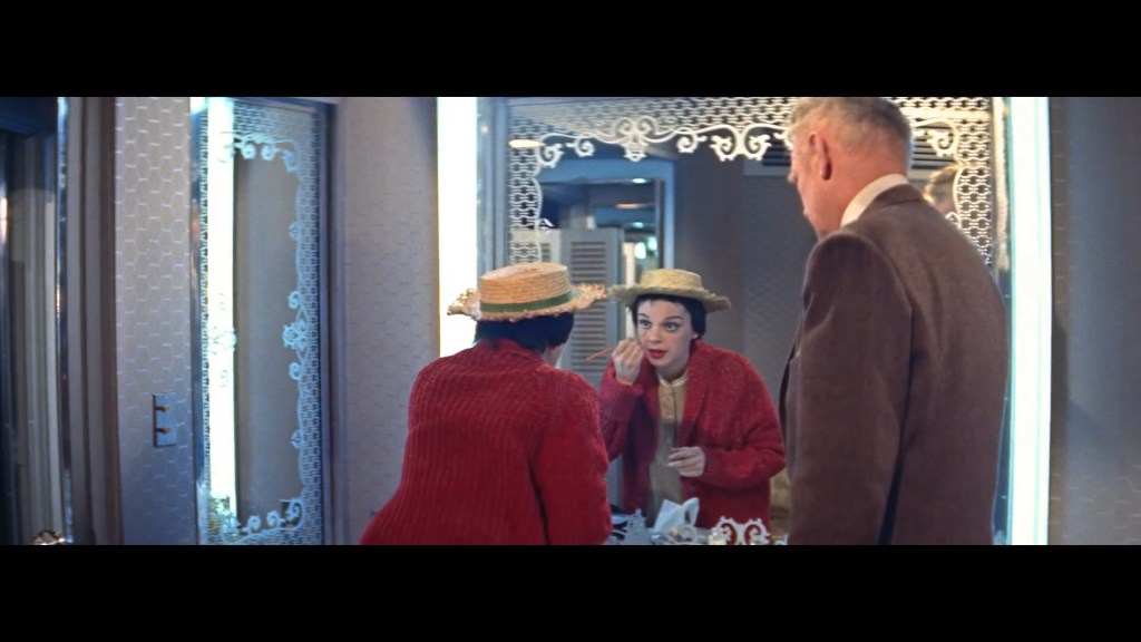 A Star is Born was to be her big comeback. She was out of a contract with MGM, and while this gave her a certain freedom, it also cost her the protection of the studio marketing machine. Sid Luft, her third husband, got her the one-off deal to make A Star is Born, a three hour musical melodrama that initially failed to recoup its massive costs. To be able to run the film more often and potentially make a profit that way, it was butchered. Whole musical numbers were cut, and in its abbreviated form, the narrative became incoherent. It took until 1983, long after Garland’s death, to restore it to its original length. Some of the footage had since been lost, as Warner didn’t bother to retain a print, and so – jarringly – stills have been superimposed over the remaining audio in order to tell the whole story. In the restored version Garland shows, like no other actor possibly could, the price of being a performer. In the part of the story where she is working on “Lose that Long Face” (Harold Arlen and Ira Gershwin) her producer enters her dressing room. Still in her short wig and ridiculous stage make-up she gives a shattering monologue about living with an addict. Then she redoes her fake freckles, marred by tears, with an eyebrow pencil and goes back on stage to belt out “put that frown upside down!”, showing just how much personal pain has to be swallowed down in order to go on with the show. The film should probably have swept the Oscars that year, it was nominated for half a dozen, but it failed to win any. Whether this was due to the slashing of the film, or because of Garland’s portrayal of the messy realities of the industry is anyone’s guess. The fact Garland lost to the immaculate glamour of Grace Kelly in Country Girl, however, is telling.