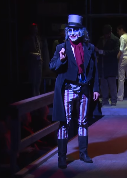 The character who sings this first song is called the Proprietor. He is a carnival huckster who sells the kind of happiness that you can use to put a bullet in another person. It’s a constitutional right, isn’t it? And in the production we saw in Edinburgh, Sondheim’s suggestions about America, patriotism, salesmanship and murder, the Proprietor looked oddly familiar. Sure, he looked like the carnival huckster he was, but he also looked like someone else. Long, thin legs, white beard, top hat, stars-and-stripesy outfit. Where had I seen this guy before?