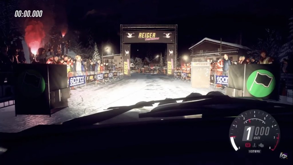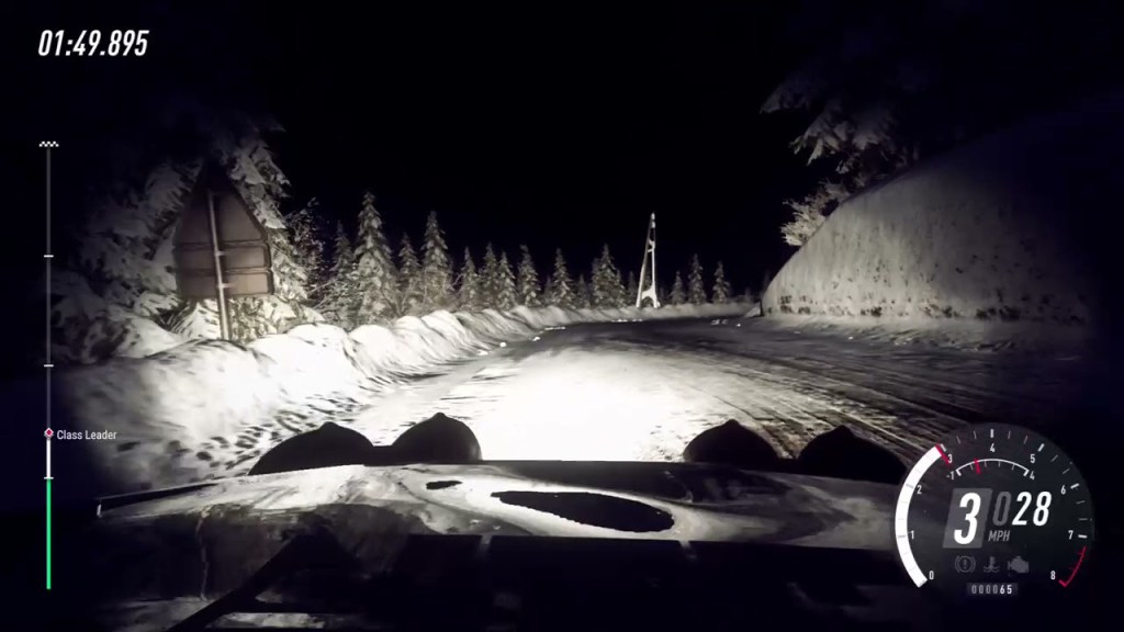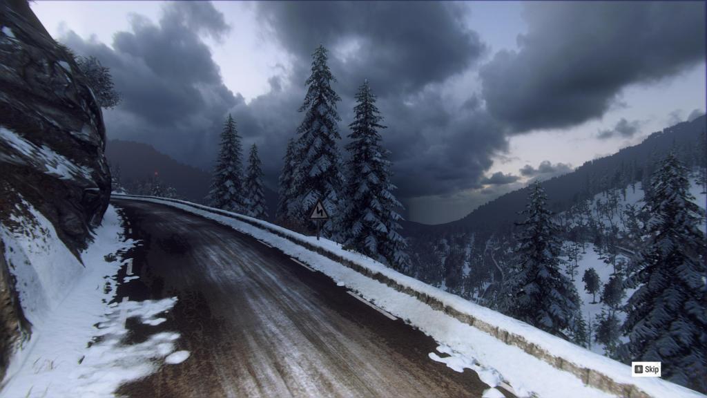 Actually, it’s even more horrifying than it already sounds, because often those stages come at a point when my driving has already resulted in extensive damage to the car I’m racing in. Cracked windshields, dented bodywork, and that engine doesn’t exactly sound very good anymore, does it? Though none of these are frightening, just annoying. What is truly frightening: damage to my lights. Knowing that one bump may result in me seeing pretty much nothing. Just the other day, I drove a race on the Monte Carlo track – a name that would usually make me think of Mediterranean luxury, casinos, men in tuxedos and women in dresses that cost more than I make in several months, most likely. But the Monte Carlo track in this game is set high up in the Alpes Maritimes. It’s cold, it’s icy, the road barely offers any traction. There are occasional piles of snow alongside the road, but on one side there’s a rockface and on the other there’s usually a steep drop to the valley below, and when I’m anywhere above 30 km/h, I doubt that the flimsy little railings will hold the car I’m sitting in that weighs more than one ton.