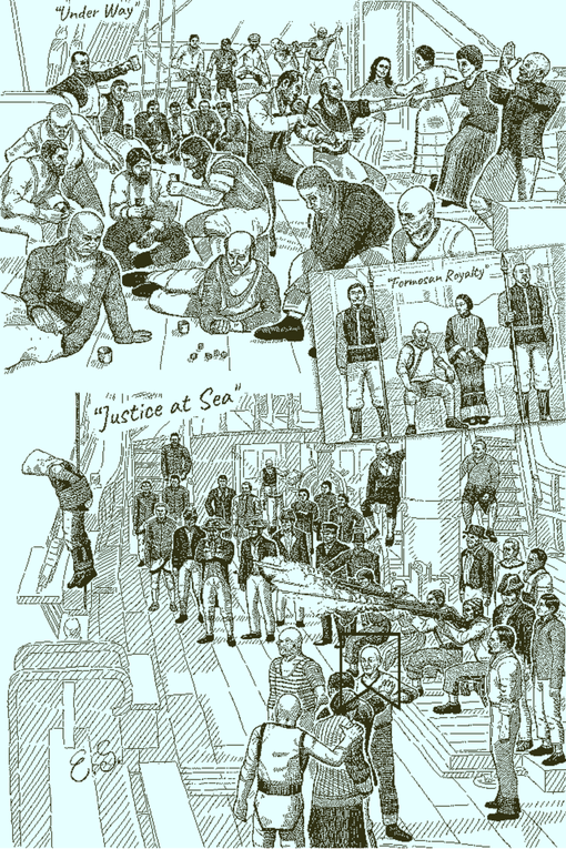 Return of the Obra Dinn is a detective game – well, of sorts. The game, developed by a sole madman called Lucas Pope (doing the design, writing, graphics, music and sound, though thankfully getting in voice actors to do the dialogues), asks you to take the part of an insurance inspector working for the East India Company, and to investigate the Obra Dinn, a merchant ship that has been missing for years and that has reappeared with not a living soul aboard. Games being games, you’re given a magic pocketwatch that you can use on corpses (or any remains of a living being, really), which allows you to witness their final moments and explore the instant at which they died as a sort of diorama. Your task is to determine who these dead are, how they died and by whose hands (if indeed they died by the hands of a who, rather than by rather more strange means). You also have access to a logbook that includes a drawing of the crew members and maps of every deck of the ship, and that conveniently lists everyone who was aboard the Obra Dinn, from the captain and officers to seamen, topmen and midshipmen, but also various passengers – and yes, all these terms will end up being relevant. The man in the uniform? Probably the captain, based on the uniform and only one person in the drawing wearing that particular outfit. But what about those three guys over there in slightly different uniforms? What about the men who clamber the masts? What about those two who are always close to the carpenter’s quarters?