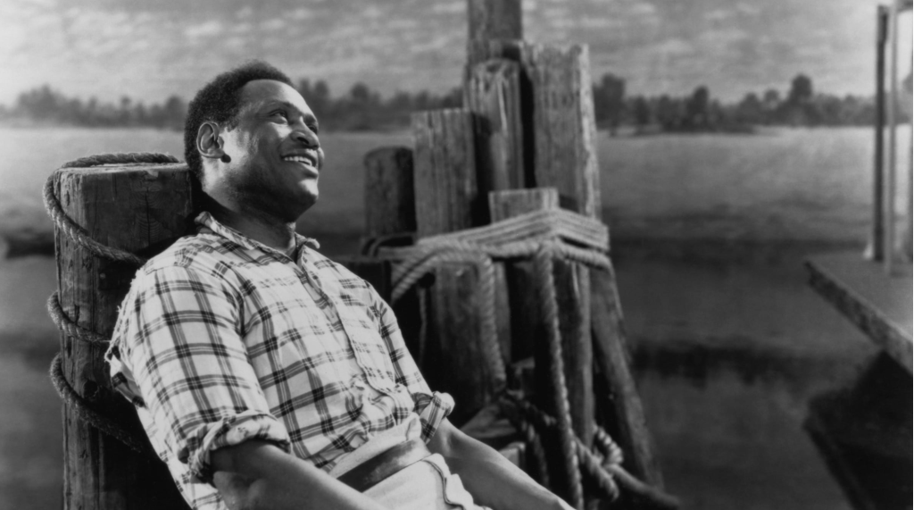 This latter plot strand highlights Show Boat‘s interest in matters of race in the Southern states of the US, but this interest is also seen elsewhere: Show Boat begins with a title sequence in which black dock workers sing “Cotton Blossom”: “Here we all work on de Mississippi/Here we all work while de white folks play/Loadin’ up boats wid de bales of cotton/Gettin’ no rest till de Judgement Day”. It’s not exactly W.E.B. Du Bois, but neither would I have expected a big Hollywood musical of the 1930s to address the legacy of slavery. Later, we get “Ol’ Man River”, sung by Paul Robeson – and it is startling to see how the film handles race, and especially its African American character Joe and actor Robeson. Like “Cotton Blossom”, the song speaks of the situation of black labourers in the South: where the Mississippi “don’ plant taters,/He don’t plant cotton”, “dem dat plants ’em/Is soon forgotten”. The song, and Robeson’s performance of it, carries a degree of pathos and humanity that makes it easy to forget “Make Believe”, the romantic song that precedes it – and the romance that is reserved for the white protagonist. Moreover, the way “Ol’ Man River” is staged doesn’t just focus on Joe’s humanity and the deplorable treatment of African American labourers in the South even after the official end of US slavery: the way the camera shoots Robeson highlights his attractiveness. He brings a charisma to Show Boat that makes you wish the film was about him.