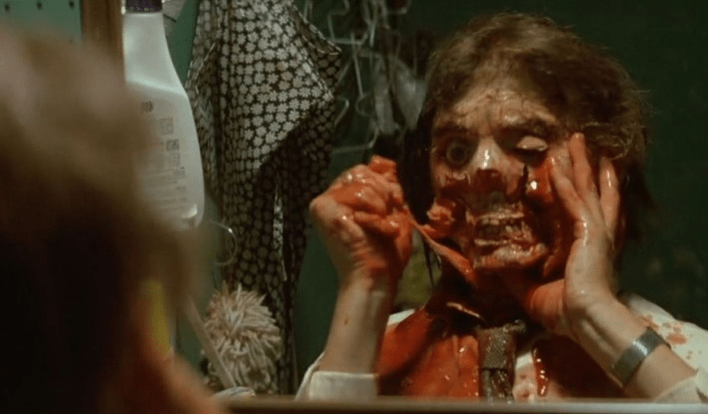 You probably remember that scene from Poltergeist (the 1982 original, not the 2015 remake): Marty, one of the parapsychologists investigating the Freeling home, goes to the kitchen at night, grabs some food from the fridge – and finds that what he’s taken seems possessed and infested with maggots and evil. Understandably taken aback, he runs to a nearby utility room, he splashes water on his face… and then watches himself in the mirror as slits and cracks open in his face. Blood drips in the sink. And as we’re watching, a horrified Marty pulls off his face chunk by chunk, revealing blood, flesh and bone. A flash of light! – and Marty’s face is where it belongs, where it’s always been. It’s all been in his head… or has it?
