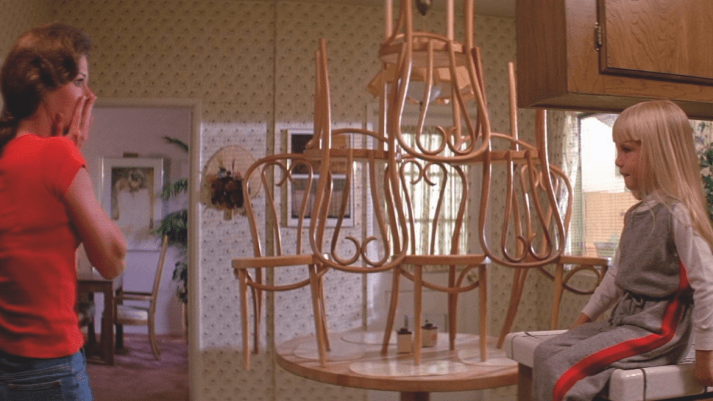 And when I first saw the face-off scene in its full, cheesy glory: Reader, I was not impressed. I found it tacky, camp in that Sam Raimi way that works brilliantly in a Sam Raimi movie (at least when Raimi’s at the top of his game), but an odd fit for Poltergeist, whose best scenes I always thought were its quieter ones: the chairs in the kitchen rearranging themselves when no one’s looking, and of course Carol Anne’s eerily relatable fixation with the television. Sure, Poltergeist goes full haunted-house amusement ride at the end, with coffins and corpses erupting from the ground like a paranormal game of Whac-A-Mole that can only be lost, but that’s after 100 minutes of build-up. What comes before is generally more subtle – or at least more subtle than some dude pulling off his Play-Doh face while dripping litres of fake blood into the sink.
