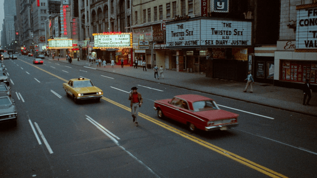 Schlesinger’s New York is a nightmarish place. Its denizens are crooks, crazies, sad and lost souls, trying to keep their heads above water, if just barely. Joe Buck, something of an innocent in spite of his career ambitions in the world’s oldest profession, is no match for them: the first trick he tries to turn, a middle-aged woman that has seen better days herself, ends up getting him to pay her after they’ve had sex. Next, he falls for Rizzo’s con, and the man he’s sent to see turns out not to be a pimp but an unhinged religious zealot. Everyone in Joe’s path seems out to get him in one way or another. This Big Apple is rotten to its core. It is a place that will chew you up and spit you out.