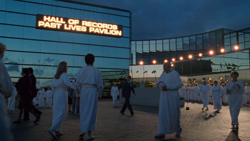 Reader: it backfired. Don’t get me wrong: Defending Your Life isn’t outright bad, and there are things I found I still liked about it. For one thing, while I must confess that I’m not exactly a big fan of Meryl Streep, she is both fun and funny in this one. Her performance as Julia, the woman Daniel (played by writer-director Brooks himself) finds himself falling for during the few days before moving on to his next life, is winning and very different from her many more dramatic roles. Arguably she’s something of an early example of the Manic Pixie Dream Girl trope, but she lends her part a warmth and a spark that make her come across as a real person even when the role remains somewhat underwritten. The satire that Brooks’ bureaucratic afterlife is infused with is also mostly amusing, even if it is too mild to be particularly critical of anything. And Brooks and his creative team have fun with a lot of ideas and especially how they’re translated into the overall look and feel of Judgment city.