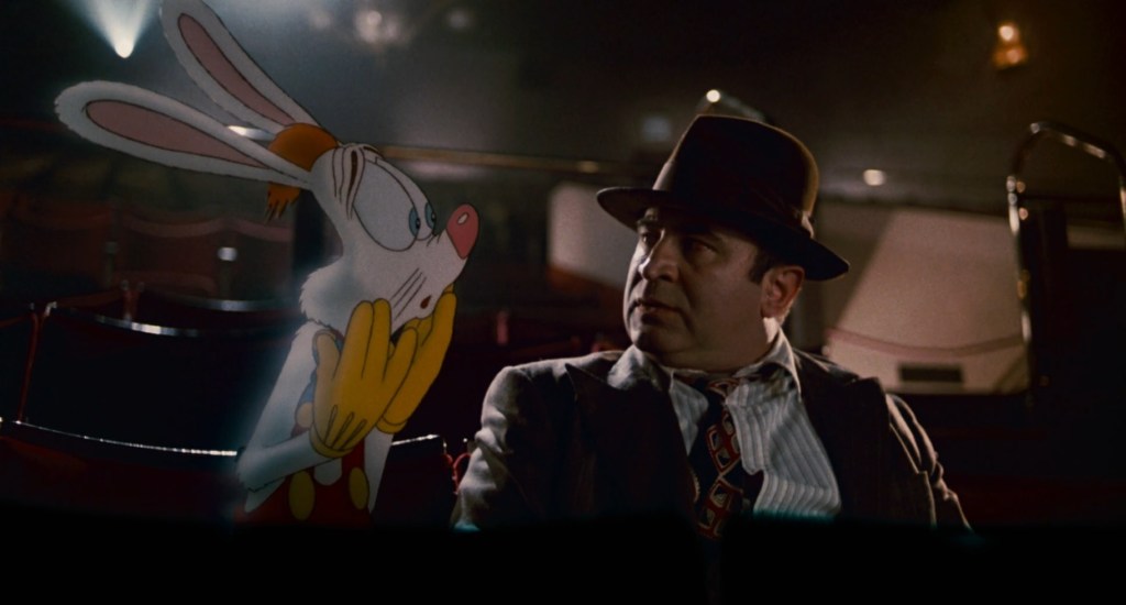 After the nostalgic tune of a bass and saxophone has sounded over opening titles, Who Framed Roger Rabbit, drops us right into the action. Cartoon action, that is, with the slightly hysterical bent of the classics, such as Tom & Jerry, Road Runner, or Bugs Bunny. The comedic star of said cartoon is the hapless Roger Rabbit (voiced by Charles Fleischer), who predictably gets hit by every possible peril a kitchen can hold, to hilarious effect. When he gets a fridge dropped on him, and chirping birds start circling around his head, we hear “CUT!” and the human director steps in, in stark live-action. “They’re supposed to be stars, not chirping birds,” he yells at the cartoon rabbit. And so we enter into a live-action world, as the cartoon baby from the short film (voiced by Lou Hirsch) apologises: “Sorry, Toots!” in a gritty baritone, and storms off the setm fulminating “How the hell many times do we have to do the damn scene?” Roger is clearly in trouble, as he keeps blowing his lines. His head and heart are not on the job. As Roger’s film is now seriously over budget, what with all the takes, producer R.K. Maroon (Alan Tilvern) enlists private detective Eddie Valiant (Bob Hoskins). Eddie, who looks like he’s slept in his coat, steels himself for this meeting by sipping from a whiskey flask, which he appears to keep in his shoulder holster. Maroon tells Eddie that his star Roger’s wife is “poison”, and he just wants some compromising pictures to show Roger, to cure him his adoration of her. Hard-up, Eddie reluctantly agrees. He’s clearly not a fan of “toons” as the animated characters are known in the film.