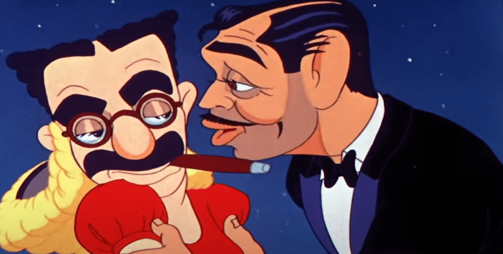 Despite this surprisoingly adult content for what would have been used as filler during kids’ TV, its also interesting as an adult to learn that the hand of censorship was to strike the original version of this cartoon. The final end would have seen Clark Gable, having chased an attractive, coy blonde for the whole cartoon, discover that in reality its Groucho Marx – but ends up giving him a big kiss anyway. This kiss has long since been excised from the cartoon and is sadly a lost scene.