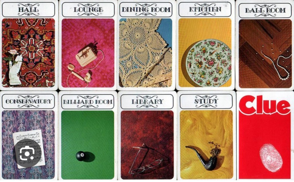 Clue, the game, was indebted of course to all the great whodunit mysteries, from Arthur Conan Doyle to Agatha Christie. It was first released in 1948 (as Cluedo in German, a combination of ‘clue’ and ‘ludo’, Latin for “I play”). The game’s premise was to find out who had committed murder, among six suspects invited to dinner at a remote mansion, each represented by one player of the game. There were also six murder weapons (a candlestick, a dagger, a rope, a lead pipe, a revolver and a wrench) that had possibly been employed, and altogether nine rooms in the mansion where the murder could take place.