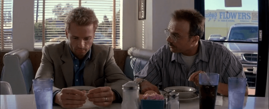 As you can imagine, Leonard’s system isn’t exactly foolproof. You can’t take a Polaroid of every moment of every day, and even if you do, photos can be stolen or destroyed. It’s a system that’s easily manipulated – by others, certainly, but even by Leonard himself. Angry at the barista who messed up your coffee order? Take a Polaroid of him and write on it, “He’s the one.” The best thing about this? Leonard won’t even remember the manipulation. And like that, he becomes the perfect instrument of revenge, to be used by others as much as by himself. His sense of self, the sense he makes of his life, has become defined entirely by his quest for revenge, and if there’s any moralistic irony to the revenge, he quite literally won’t know, so it doesn’t matter to him. We, the audience, might find irony, poignancy, or even tragedy in what Leonard does – but he doesn’t. He can’t.