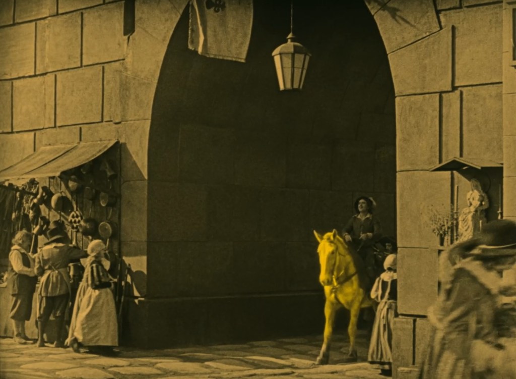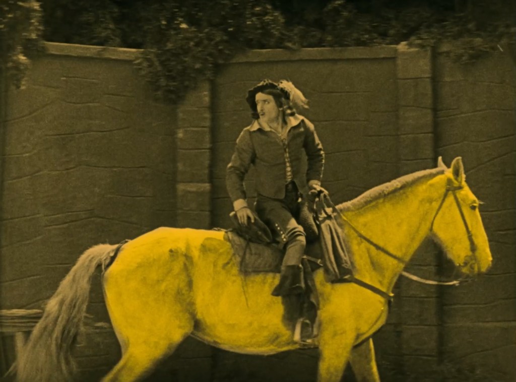 The film itself has been restored to its tinted glory by MoMA, to which Fairbanks donated his entire film collection in 1939. The original film was not black and white, as the stills show, and even had sequences partly colourized with the Handschiegl process, which is a kind of stencilling process, in which colours were applied mechanically to the black and white print, one colour at a time. Which brings us to another great star of The Three Musketeers: Buttercup, D’Artagnan’s noble steed.