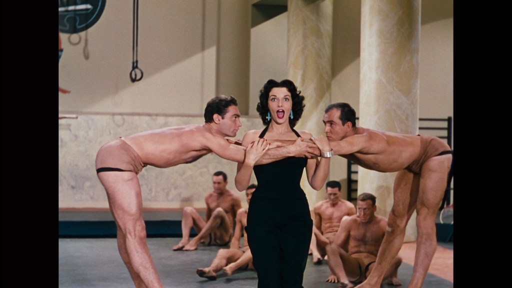 Despite its attempts at making this sex comedy’s plot as prim and proper as possible in a heteronormative sense, in many other ways the film is queer as all get-out. There is a scene in which Russell dances around in an arresting black catsuit, surrounded by athletic gentlemen in beige swimming trunks – and nothing else – in which the self-containment of the group of men is telling. “Is there anyone here for love?” sings Russell, while the men flex their muscles and do their exercises, seemingly unaware of her existence let alone her allure. It is a marvel that has to be seen to be believed: it is 1953, and this astonishing musical number made it into the film. It’s a signature set-up for the supremely gifted, and highly influential, Jack Cole: “I didn’t do the big musical numbers” Hawks would relate later, calling Cole “one of the best [dance directors] there is”*. So while Hawks might have been the main director, Cole directed the song and dance numbers, including the famous Diamonds are a Girl’s Best Friend. Their quality, and his own clear defiance of the suffocating norms of the time, still makes them sparkle to this day.