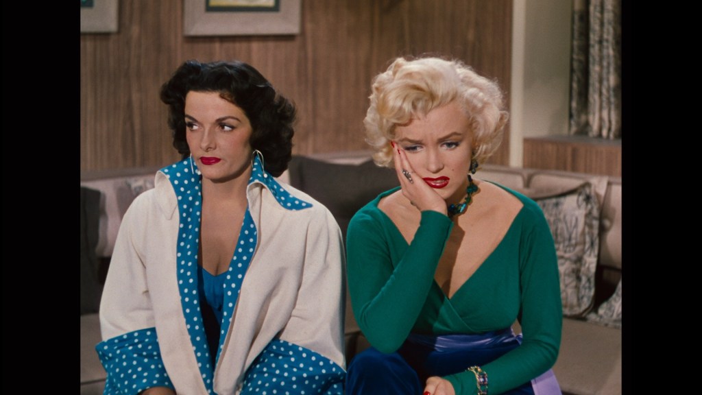 Blonde bombshell Lorelei Lee (Marilyn Monroe) wants to marry a millionaire. She’s found one, in Gus Esmond jr. (Tommy Noonan), whom she has duly wrapped around her little finger. Problem is: his father, predictably, is dead set against such a union. As Lorelei, who is in her own way rather cannier than her demeanour would suggest, wants rid of the sort of fatherly interference that might end her prospects, she decides to go on a European adventure with her friend (doubling as chaperone) Dorothy Shaw (Jane Russell). And while Lorelei’s behaviour is under a microscope due to her association with Gus, Dorothy makes it quite clear she is under no such restrictions. She wouldn’t mind a shipboard romance. (Or two. Or perhaps more, the entire Olympic team are on board after all.) She ultimately decides on the “tall dark and handsome” prospect of Ernie Malone (Eliott Reid), but he may turn out to be something other than he appears.