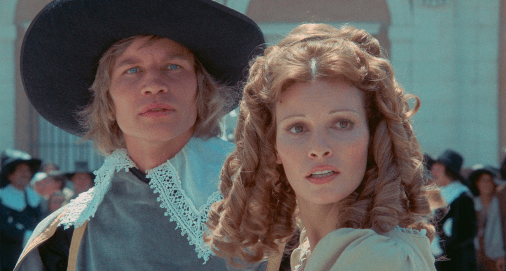 I went into these two films – which were originally filmed as one – expecting something much closer to the clichéd swashbuckler. What I got instead, especially with The Three Musketeers, is more akin to genre satire or even parody, as Lester never takes his characters, whether good or bad, and the world they inhabit altogether seriously. The title sequence is a red herring in this respect: it focuses on a shirtless D’Artagnan (Michael York, who works much better for me in comedic roles than in serious ones) fighting an opponent in what seems to be highly accomplished, energetic swordsplay. It’s the introduction of a ’70s hero – but it soon emerges that D’Artagnan is fighting his father, as the last lesson in his training as a swordsman, before the young man sets up for Paris to become one of the King’s Musketeers. However, already on his way to the city he finds himself insulted and knocked out by the man who will become his nemesis, the Comte de Rochefort (a dryly funny Christopher Lee), showing the audience that our protagonist, a country bumpkin of the highest order, is less of a hero than a fool. And his foolishness is soon highlighted even more as, once he arrives in Paris, D’Artagnan manages to insult the titular three musketeers, Athos (Oliver Reed), Pothos (Frank Finlay) and Aramis (Richard Chamberlain), one after the other, arranging for three separate duels on his first day in town. Hijinks ensue, as our protagonist first befriends the titular musketeers and then finds himself embroiled in a plot to discredit Queen Anne (Geraldine Chaplin), who is having an affair with the Duke of Buckingham.