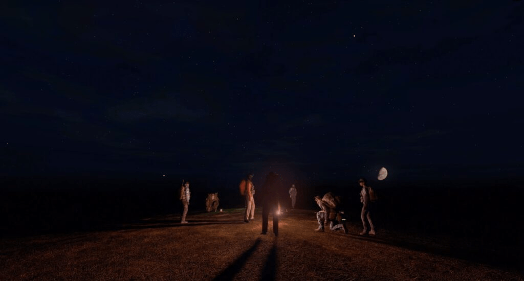 However, these uncanny deviations from reality don’t make this ethnographic expedition into a virtual world feel less real: on the contrary, they serve to highlight the ways in which socialising is socialising, whether it’s in a pub, a club or a DayZ server. A scene late in the film shows this beautifully, needing no editorial comment: the player characters we’ve spent the last hour or so with meet up after a longer hiatus, not to kill infected or grow vegetables. They just sit around a campfire, listen to music, chat, and sometimes they’re just quiet together. One of them, the Reverend Stone, falls asleep in front of his computer – and likewise, the character sits slumped in his deckchair while the other player characters around him whisper, in order not to wake him up. Other than all of them being decked out as survivalists, the scene is one that is familiar from every other late-night student party.