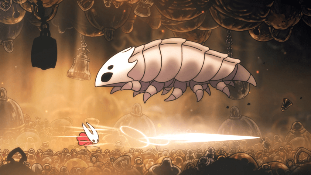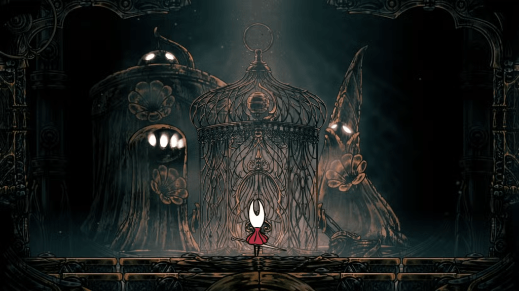 Obviously, the beautiful 2D art of the game has a large part in this, as does the elliptic, evocative writing: differently from so many video games, especially ones that pride themselves on their worldbuilding, neither Hollow Knight and Silksong favours the exposition-dump style of storytelling, instead insinuating and hinting and filtering its information through characters with their own perspectives and agendas. But, as much as these, it is the music written for the games by Christopher Larkin that gives their world and characters personality. Check out the three examples below: the tune written for Bone Bottom, a forlorn location early in the game peopled by insects at the onset of their pilgrimage to the Citadel of Pharloom, whose inhabitants try to forget that their journeys are as likely to end in death as in enlightenment; the music of Bellhart, an outpost halfway to the Citadel built around numerous bells; and the melodies of the Choral Chambers, a haunting place of gold and silk. There is a whimsical, Danny Elfman-like touch to some of Larkin’s music, which in Silksong is complemented by an ethereal sadness not unlike that of Thomas Newman’s best scores – but in all of this, the composer’s work never feels derivative but entirely of a piece with the world Team Cherry has created.